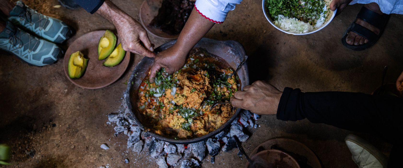 We begin in Ayutla, where Regina Domínguez welcomes us into her home with a taste of Maats’y, or Machucado: an ancestral dish of smashed sopes and creole bull meat.